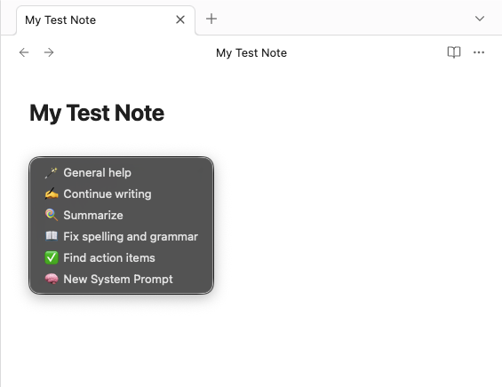 Press the hot key you assigned for “Local GPT: Show context menu” (e.g., ⌘ + M). It will open a context menu with various AI actions you can perform on the selected text: